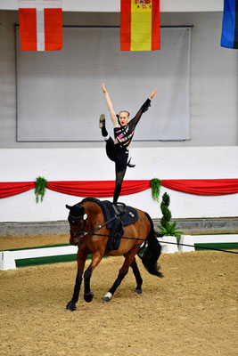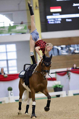 Ebenfalls auf höchstem Niveau unterwegs war Jenni, die sich im Junior Einzelvoltigieren mit Samor und Longenführerin Katja der starken Konkurrenz stellte. Bereits in der Pflicht überzeugte sie mit 7,800 Punkten, in der ersten Kür dann ein weiteres Highlight: Ausdrucksstark, sicher, mitreißend – das wurde mit 7,950 Punkten belohnt. In der Finalkür am Sonntag steigerte sich Jenni noch einmal und zeigte mit ihrer Cowboy-Kür die beste Kürwertung ihrer Kategorie – 8,268 Punkte bedeuteten am Ende den Gesamtsieg! Eine unglaubliche Leistung in einem Feld hochkarätiger Voltigiererinnen.