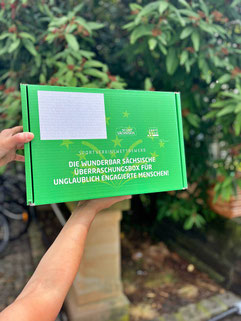 In der Geschenkbox mit dem treffenden Namen "Die wunderbar sächsische Überraschungsbox für unglaublich engagierte Menschen" befanden sich nicht nur eine wundervolle Schärpe, etwas Party-Equipment und unser Geburtstagsgeschenk für Katja, sondern auch eine Urkunde und eine praktische Wasserflasche.