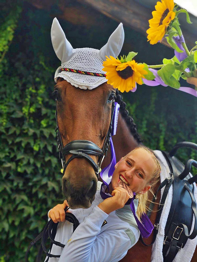 Wir können nicht stolzer sein und gratulieren ihr, Katja und Cascais in ihrer ersten U21-Europameisterschaft zu ihrer Bronzemedaille. Unendlich stolz sind wir natürlich auch auf Katja und Cascais, die in zwei Umläufen ganz vorne in der Pferdenote abgeliefert haben.